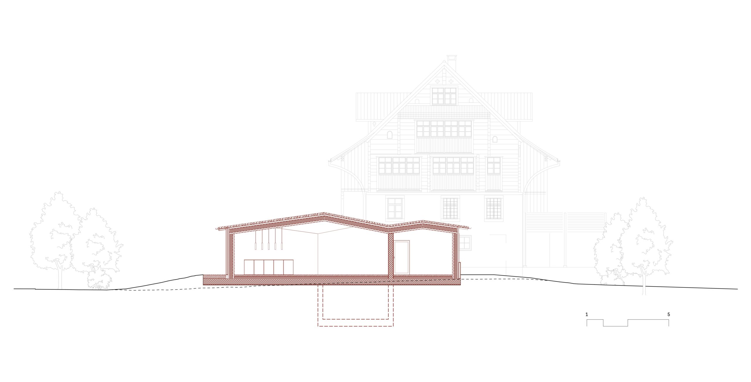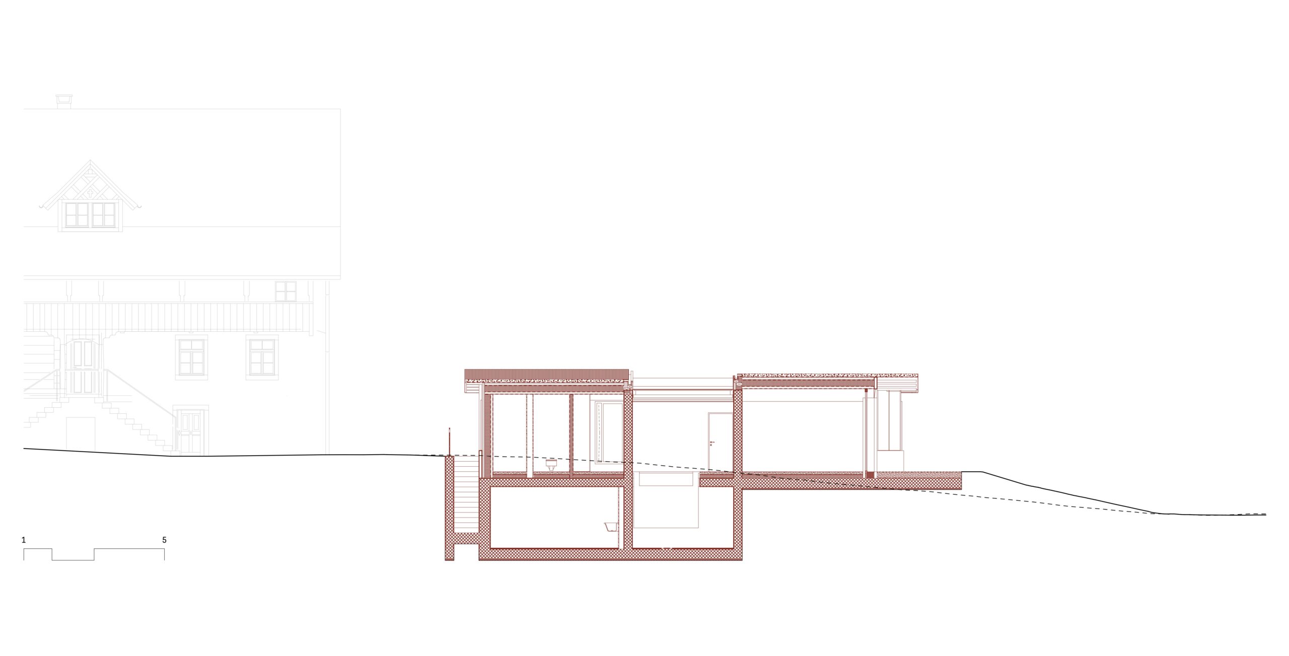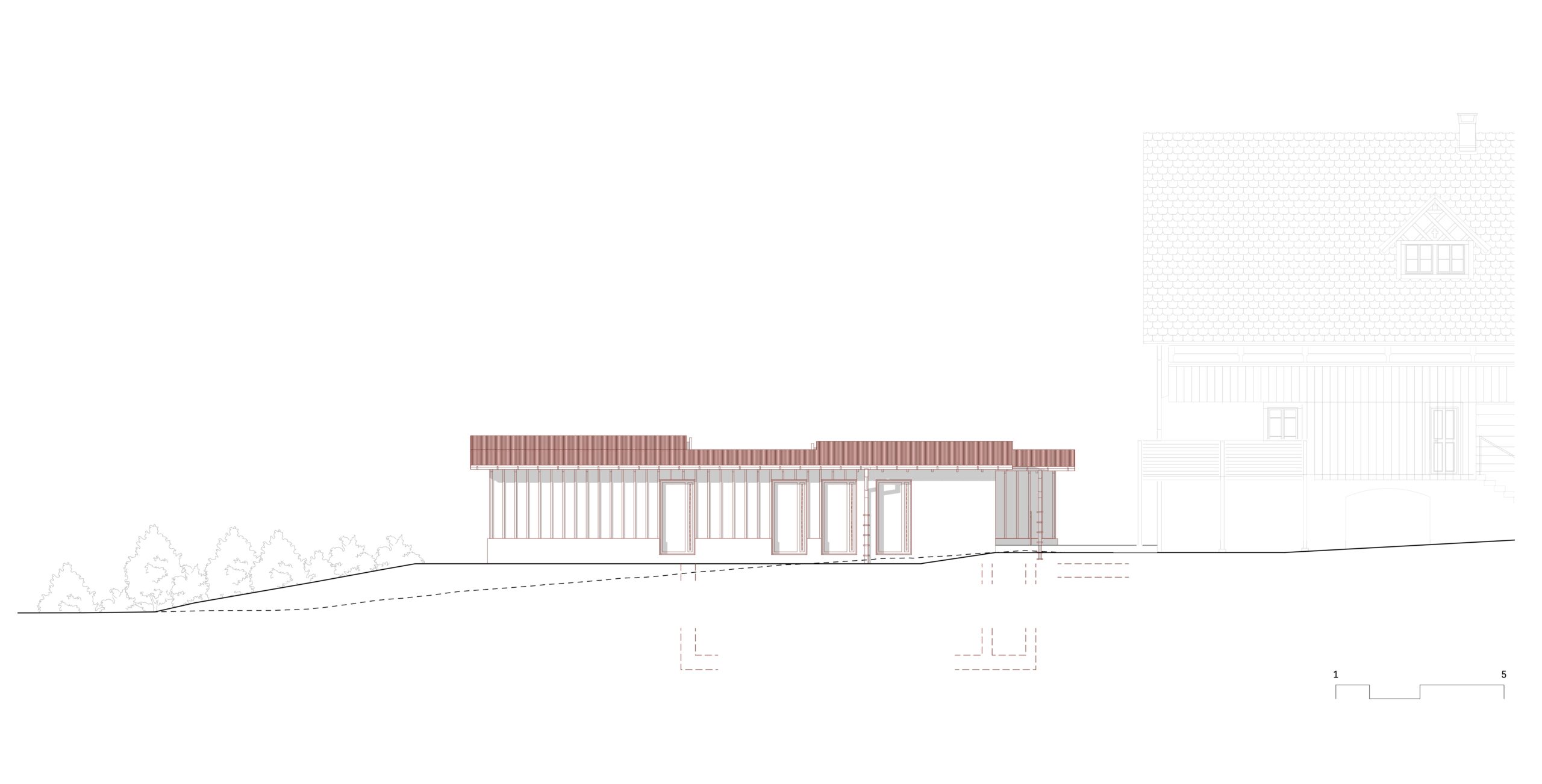 Die Liegenschaft sollte durch einen sensibel proportionierten, eingeschossigen Neubau erweitert werden, der sich in seiner Volumetrie, Tektonik und Materialwahl bewusst dem historischen Bestand unterordnet. Der Neubau tritt architektonisch zurückhaltend in Erscheinung und wahrt in seiner Setzung die visuelle und räumliche Dominanz des denkmalgeschützten Bauernhauses.