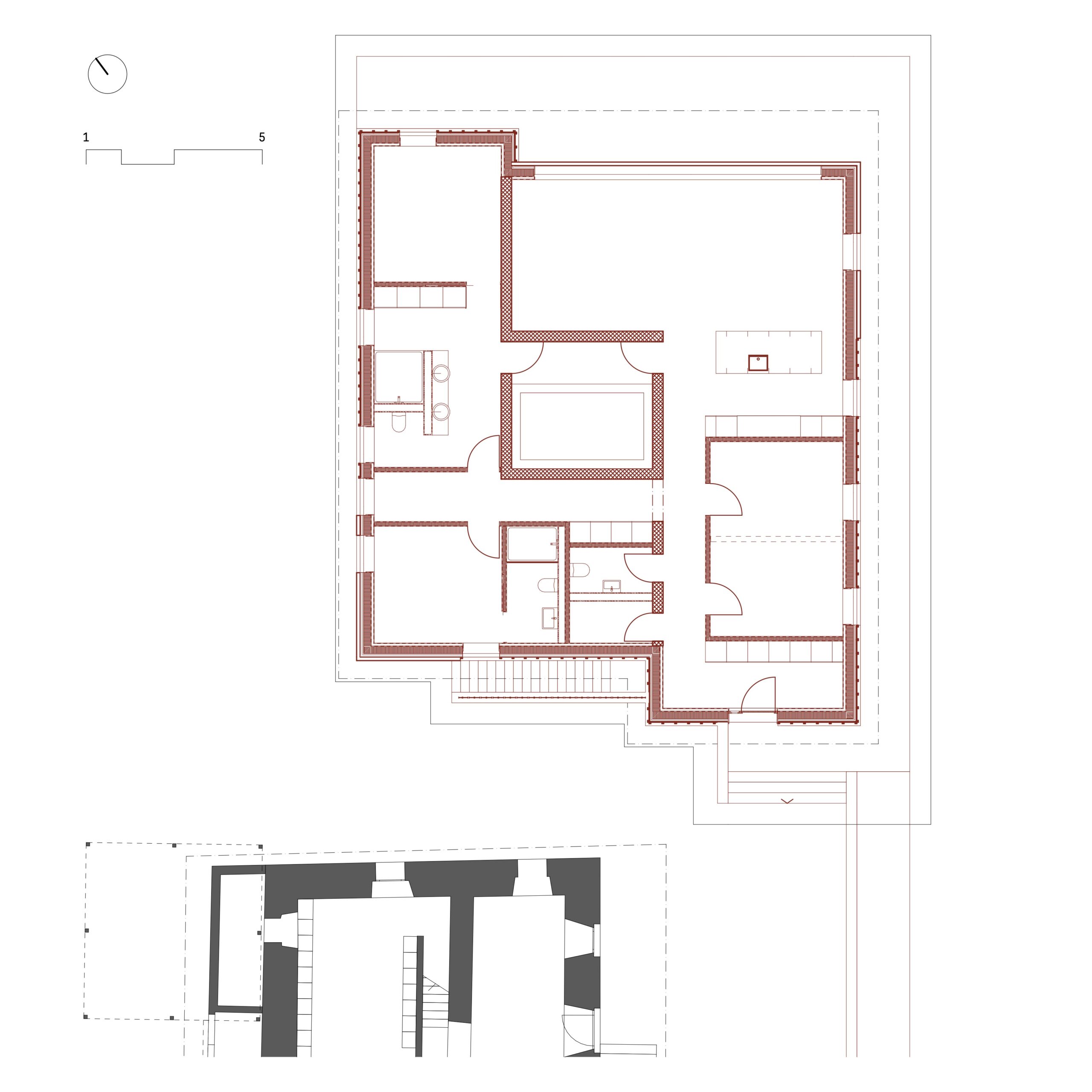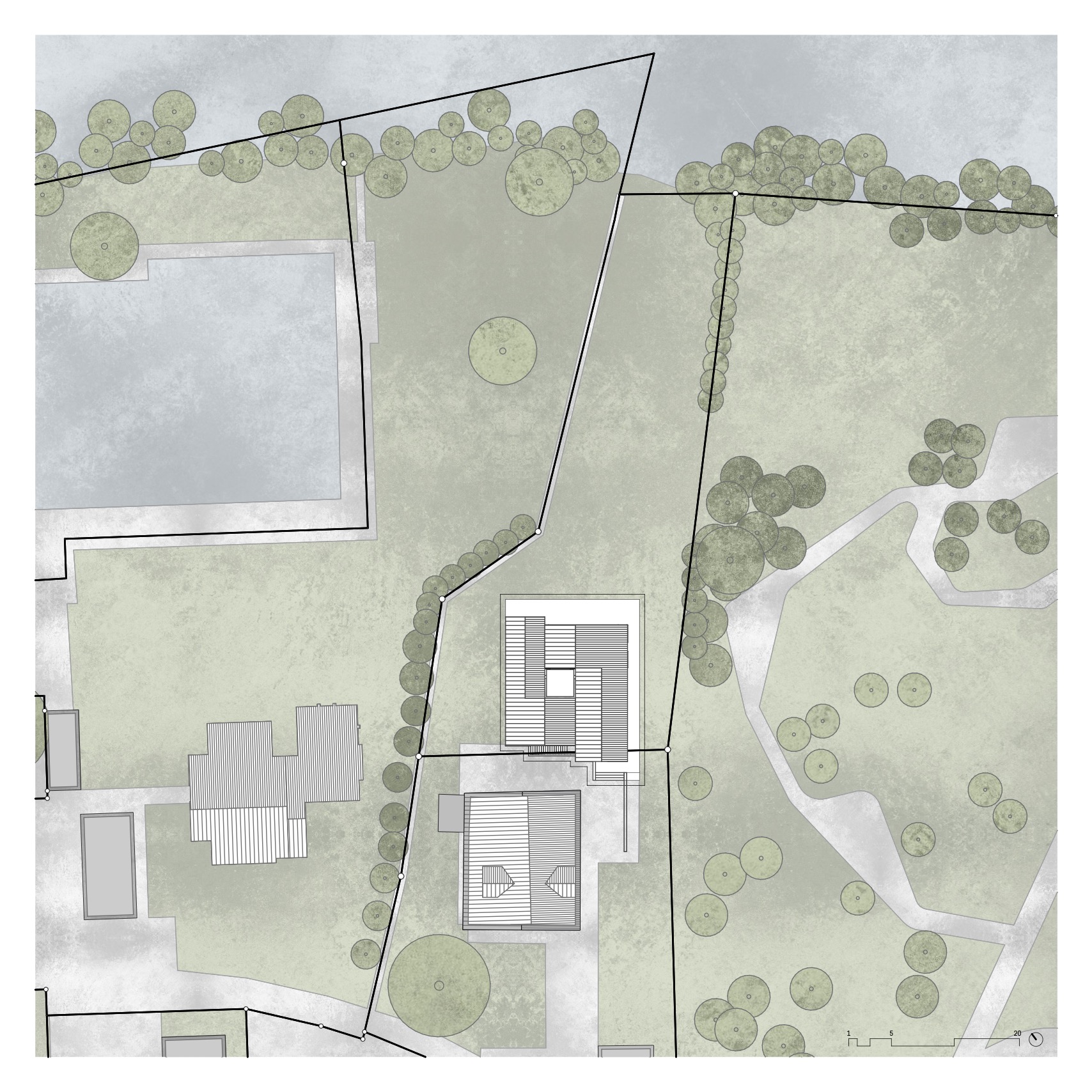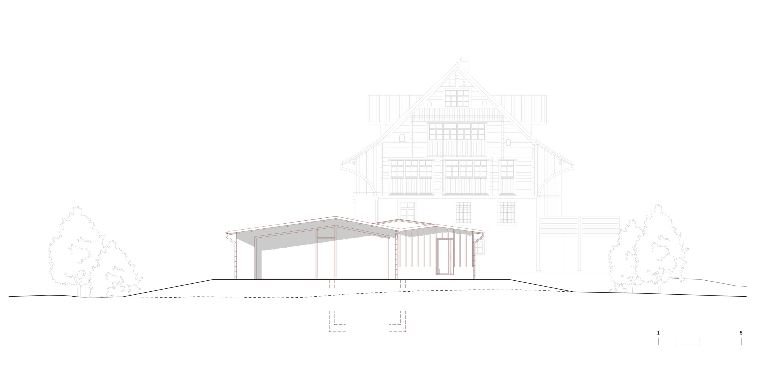 Die Liegenschaft sollte durch einen sensibel proportionierten, eingeschossigen Neubau erweitert werden, der sich in seiner Volumetrie, Tektonik und Materialwahl bewusst dem historischen Bestand unterordnet. Der Neubau tritt architektonisch zurückhaltend in Erscheinung und wahrt in seiner Setzung die visuelle und räumliche Dominanz des denkmalgeschützten Bauernhauses.