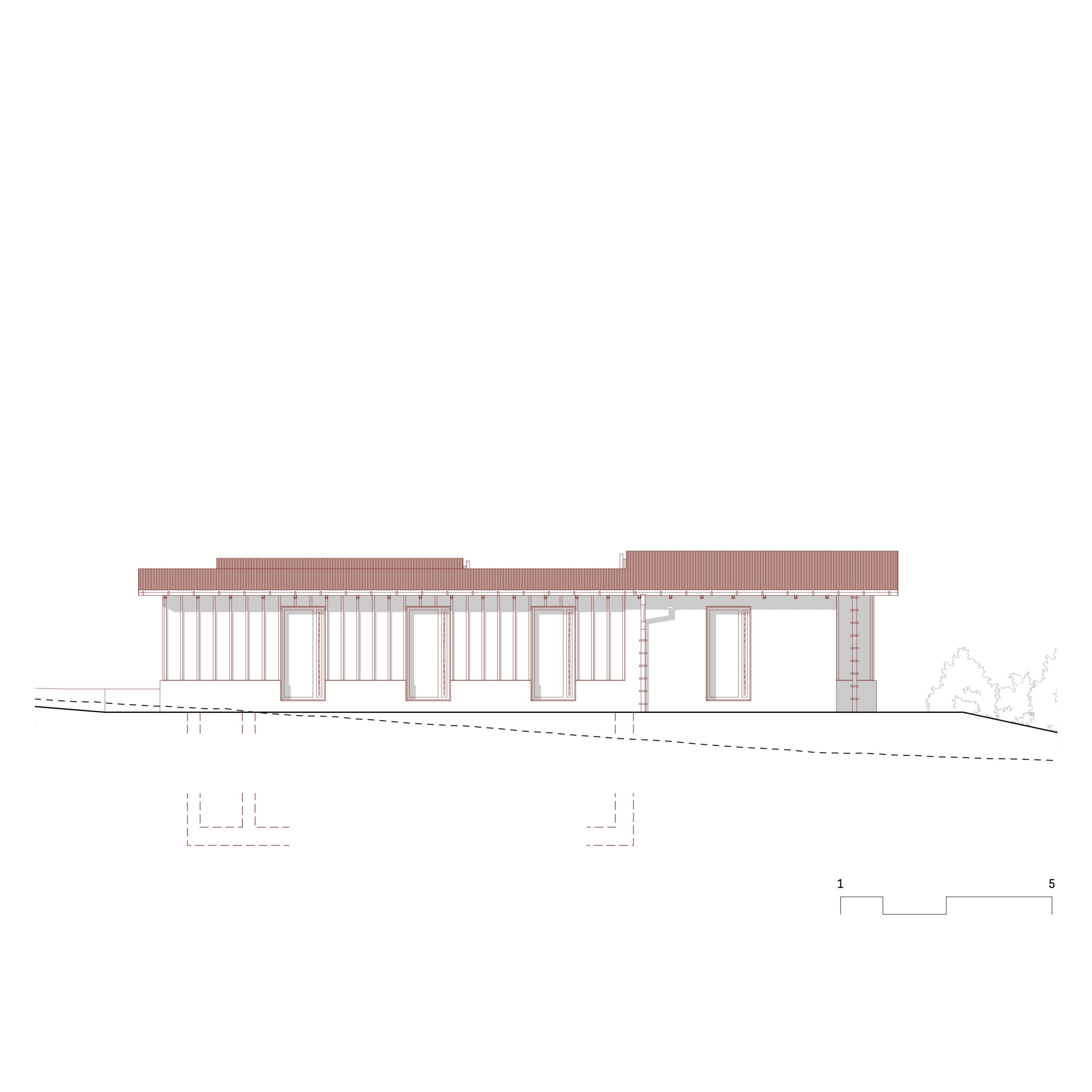 Die Dachform des Neubaus ist als zeitgenössische Interpretation regionaltypischer Satteldächer zu verstehen und nimmt Bezug auf die horizontale Gliederung der Seelandschaft. Der Einsatz ortsüblicher Materialien wie Kalkputz, sägeraues Holz und Naturstein unterstützt die kontextuelle Einbindung des Baukörpers in die gewachsene Kulturlandschaft. Es entsteht ein atmosphärisch dichter, landschaftlich verankerter Bau, der eine subtile architektonische Dialogführung mit dem Bestand ermöglicht, ohne in gestalterische Konkurrenz zu treten.