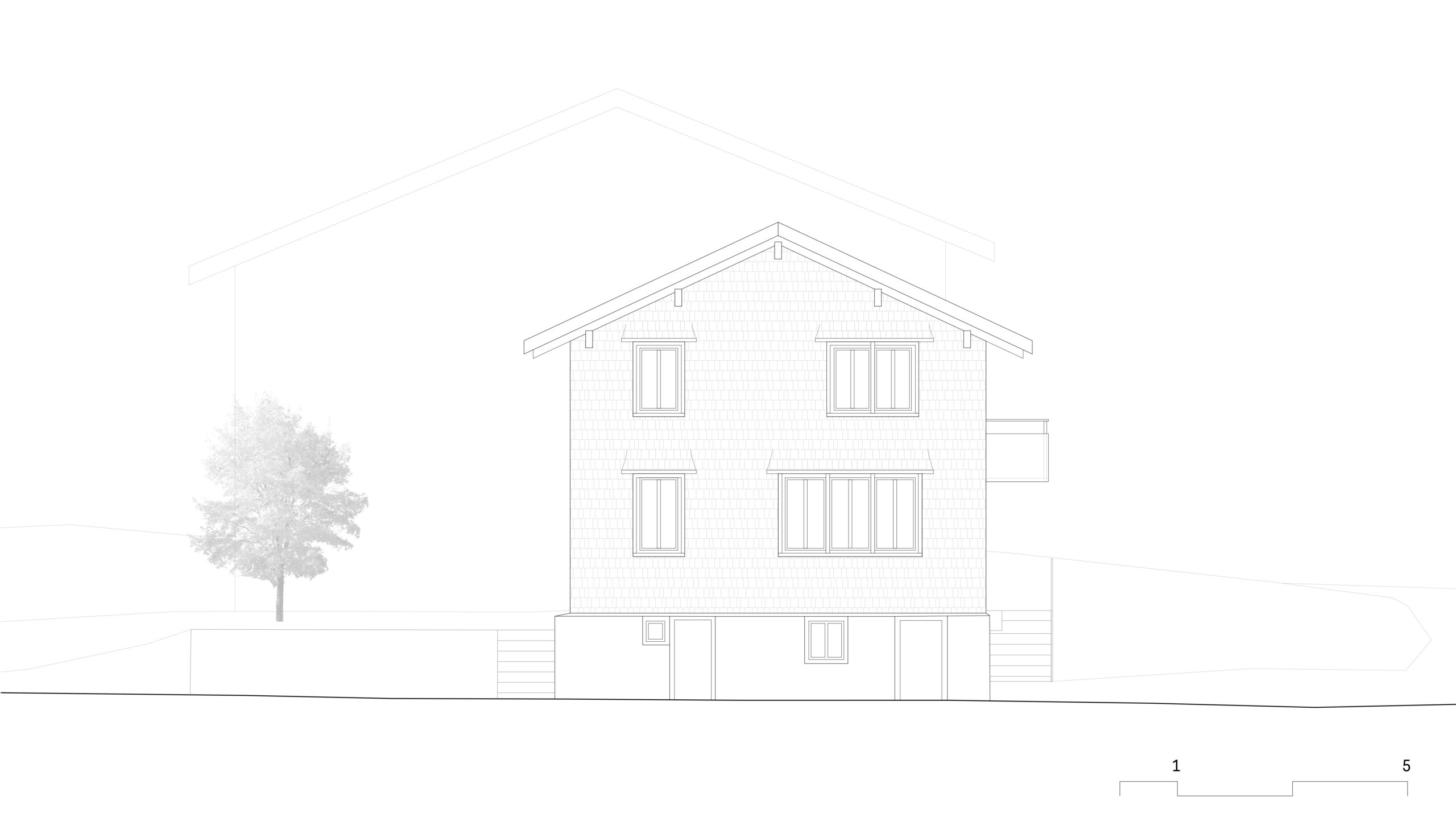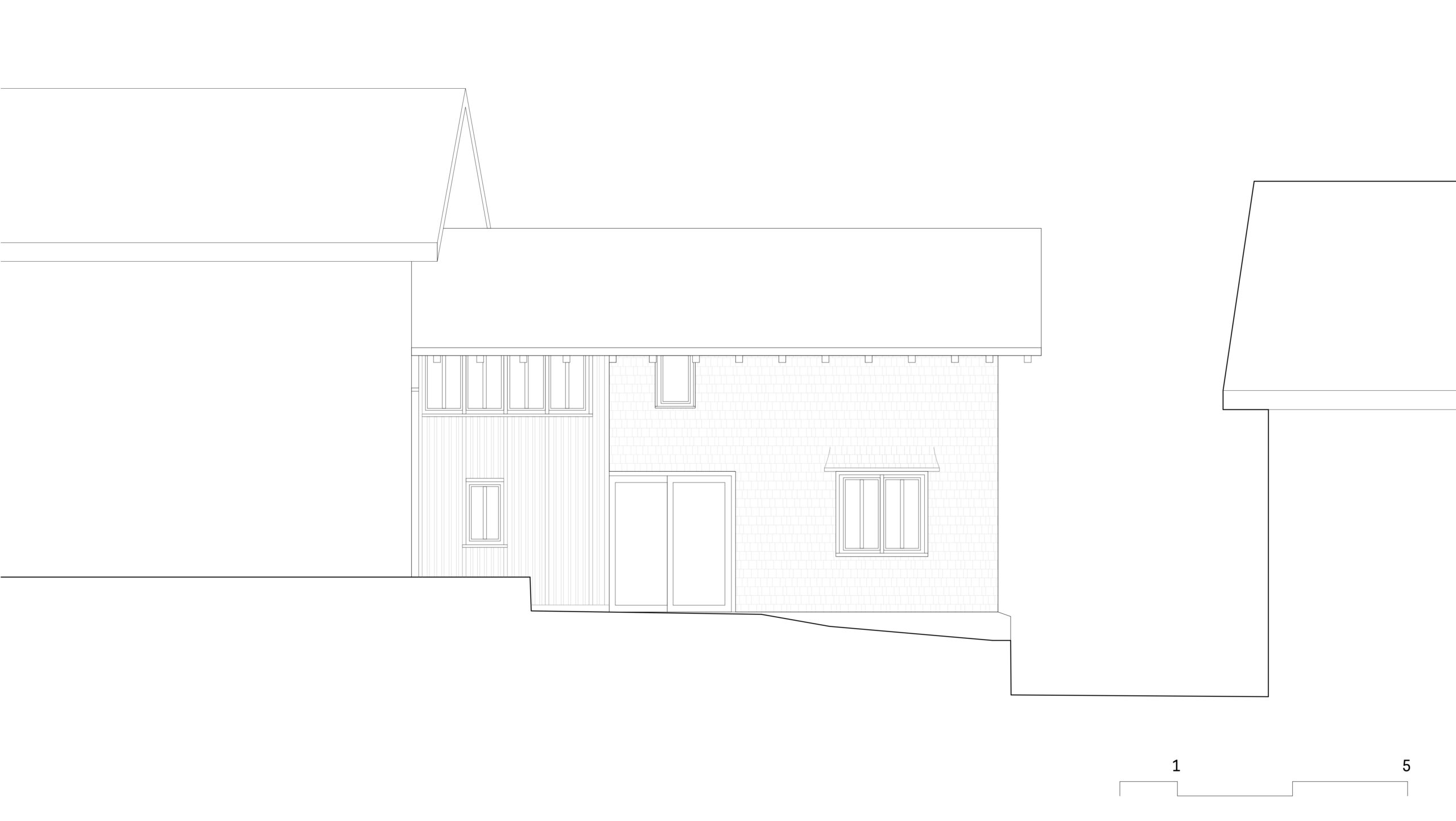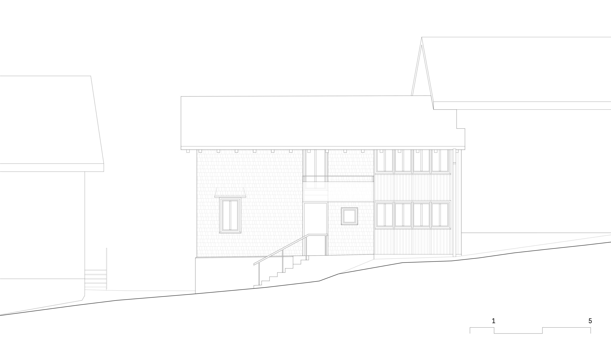 Der bestehende Anbau wird aufgrund seines baulichen Zustands rückgebaut und durch einen Neubau in zeitgenössischer Fachwerkbauweise ersetzt. Dieser Neubau nimmt konstruktiv Bezug auf die handwerklichen Traditionen der Region, übersetzt sie jedoch in eine klare, moderne Formensprache. Aussen wird der neue Baukörper mit einer vertikal geführten Holzschalung verkleidet, die sich bewusst vom Schindelkleid des Altbaus absetzt und so die Lesbarkeit der unterschiedlichen Bauphasen unterstützt. Im Inneren bleibt das neue Fachwerk offen sichtbar und bildet ein Pendant zur sichtbaren Strickstruktur des Walserhauses, wodurch eine spannungsvolle Beziehung zwischen Alt und Neu entsteht.
