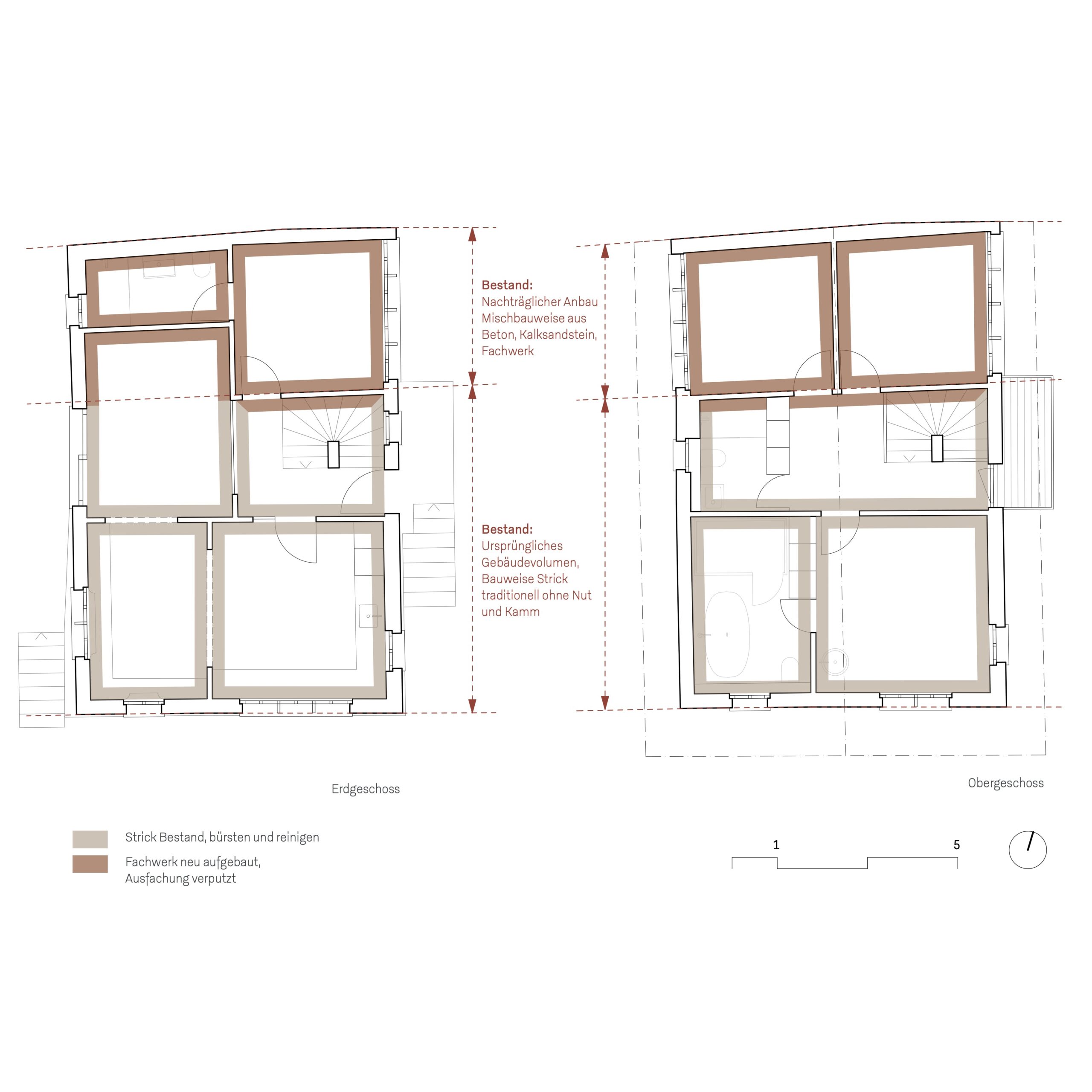 Im Laufe der Nutzungsgeschichte wurde im nördlichen Teil des Hauses ein Anbau erstellt, um dem gesteigerten Raumbedürfnis der Bewohnerschaft Rechnung zu tragen. Dieser Erweiterungsbau wurde in Mischbauweise errichtet – mit tragenden Elementen aus Fachwerk, ergänzt durch Beton und Kalksandstein. Obwohl dieser Eingriff funktional nachvollziehbar war, wurde in der handwerklichen Ausführung auf die Baukunst des Bestandes wenig Rücksicht genommen. Die bautechnischen Untersuchungen zeigen, dass in mehreren Bereichen des Anbaus konstruktive Mängel vorhanden sind. Insbesondere im Bereich des Holzes konnte aufgrund unzureichender konstruktiver Ausbildung eine deutliche Fäulnisbildung festgestellt werden. Diese Schäden sind als Folge materialtechnischer Inkongruenz und mangelhafter bauphysikalischer Abstimmung zu interpretieren.