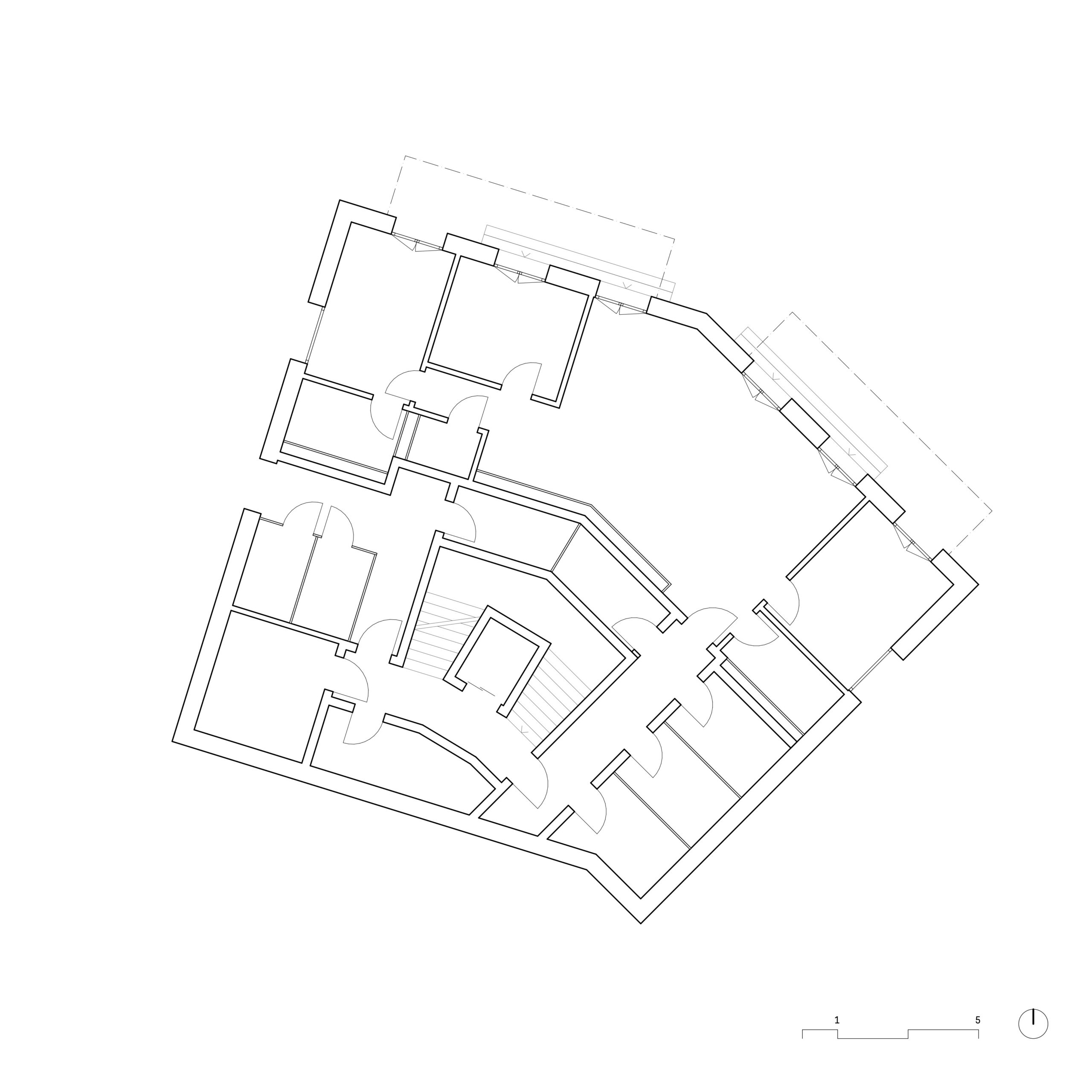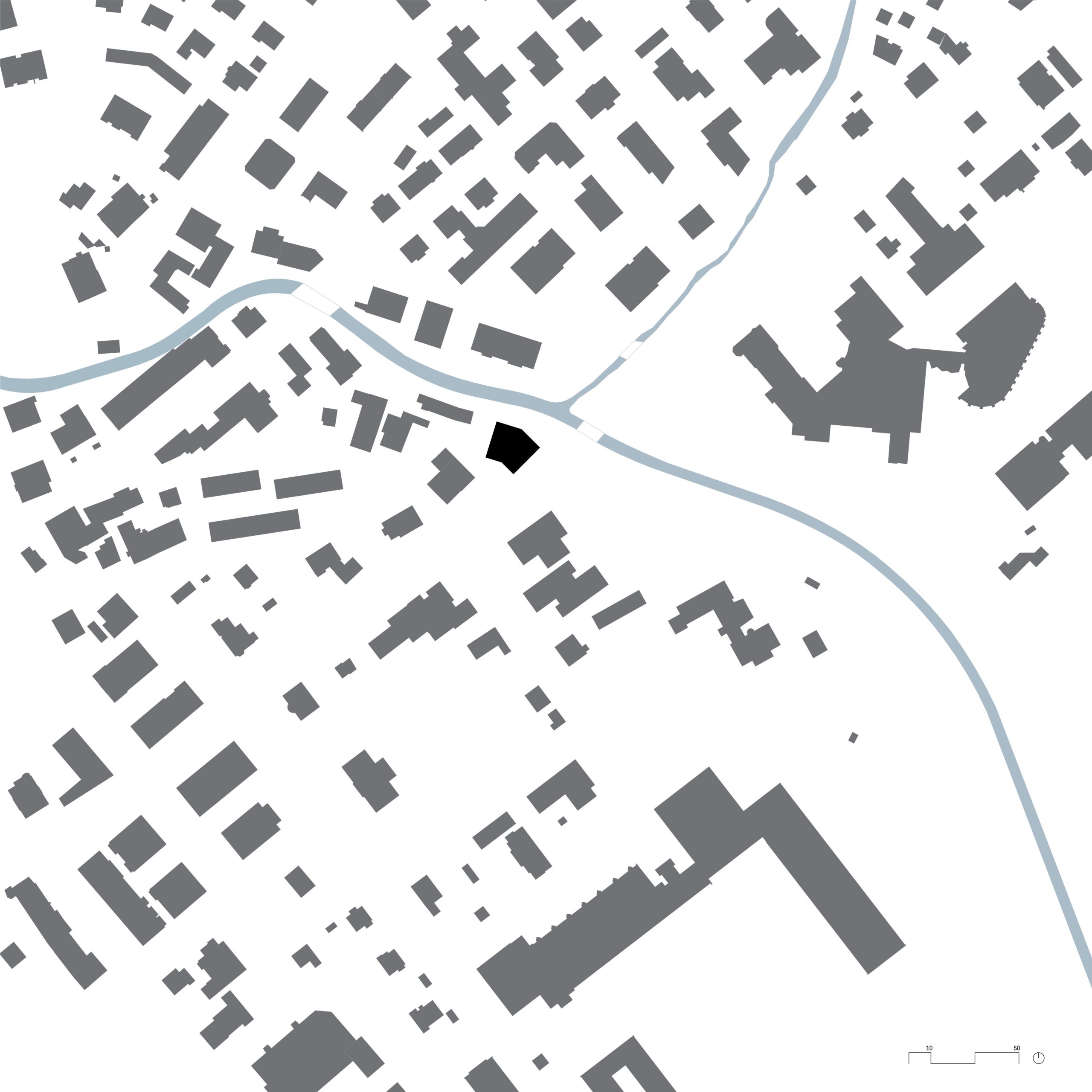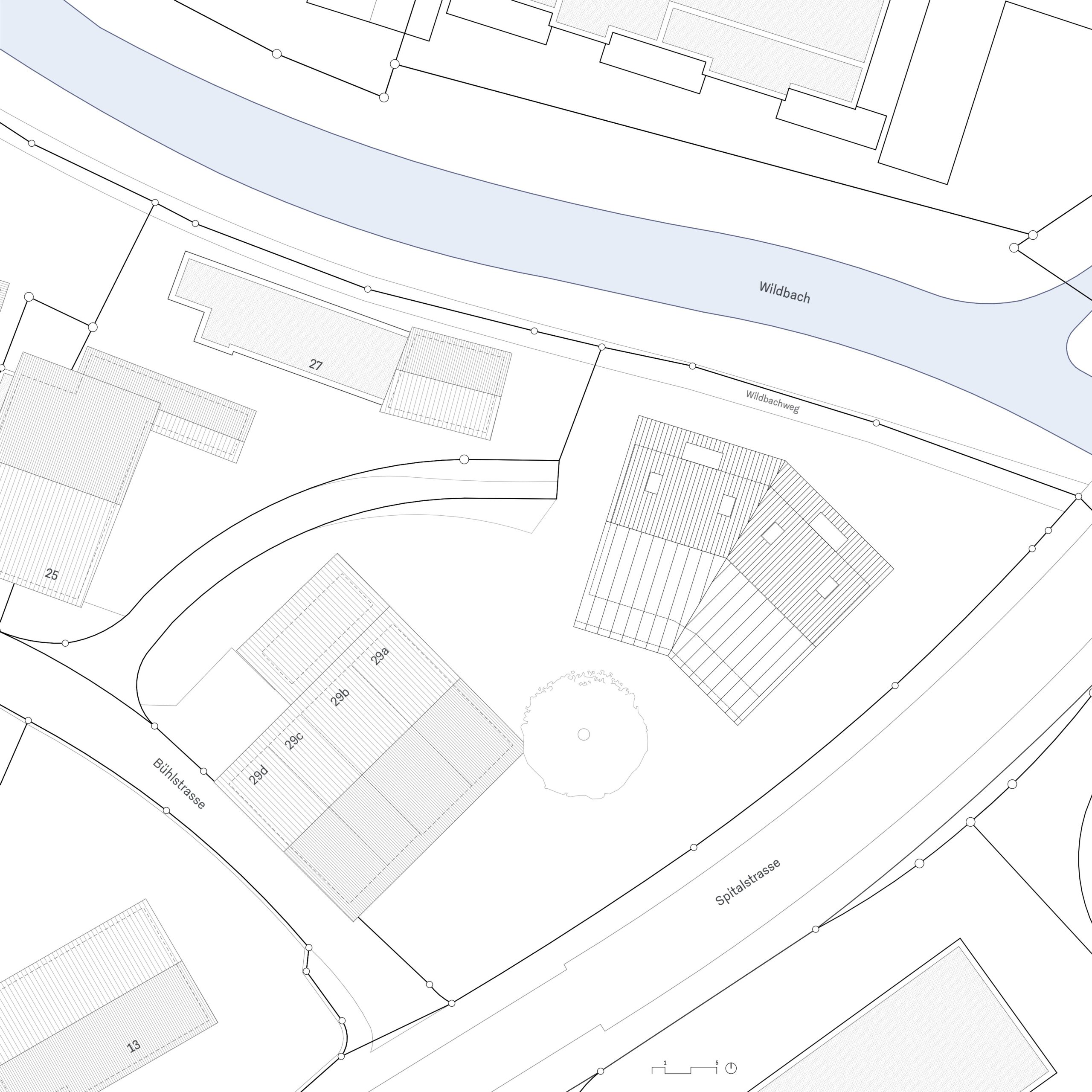Das neue Volumen bildet das Gelenk zwischen zwei Welten: auf der einen Seite die historische Dorfzone mit dem mäandrierenden Bachlauf, auf der anderen die Spitalstrasse mit ihrer heterogenen Bebauungsstruktur. Der Entwurf reagiert auf beide Seiten – durch seine gestaffelte, gefächerte Form, die sich am Ort verankert und gleichzeitig Raumbezüge neu denkt. Das Gebäude platziert sich dort, wo einst die „Sennhütte“ stand, rahmt den Bachraum und schafft einen kraftvollen Abschluss des bestehenden Gebäudeensembles. Gegen die Spitalstrasse hin fasst das Volumen den Raum und schärft die ortsbauliche Kante.
