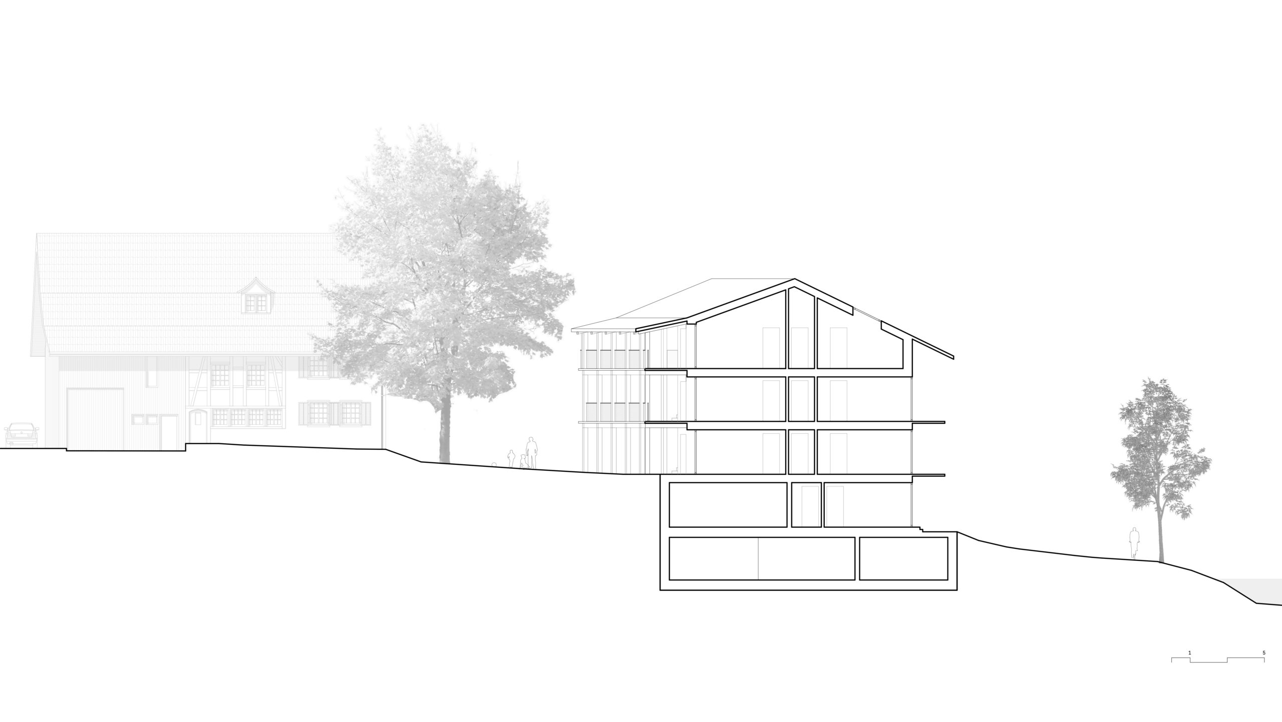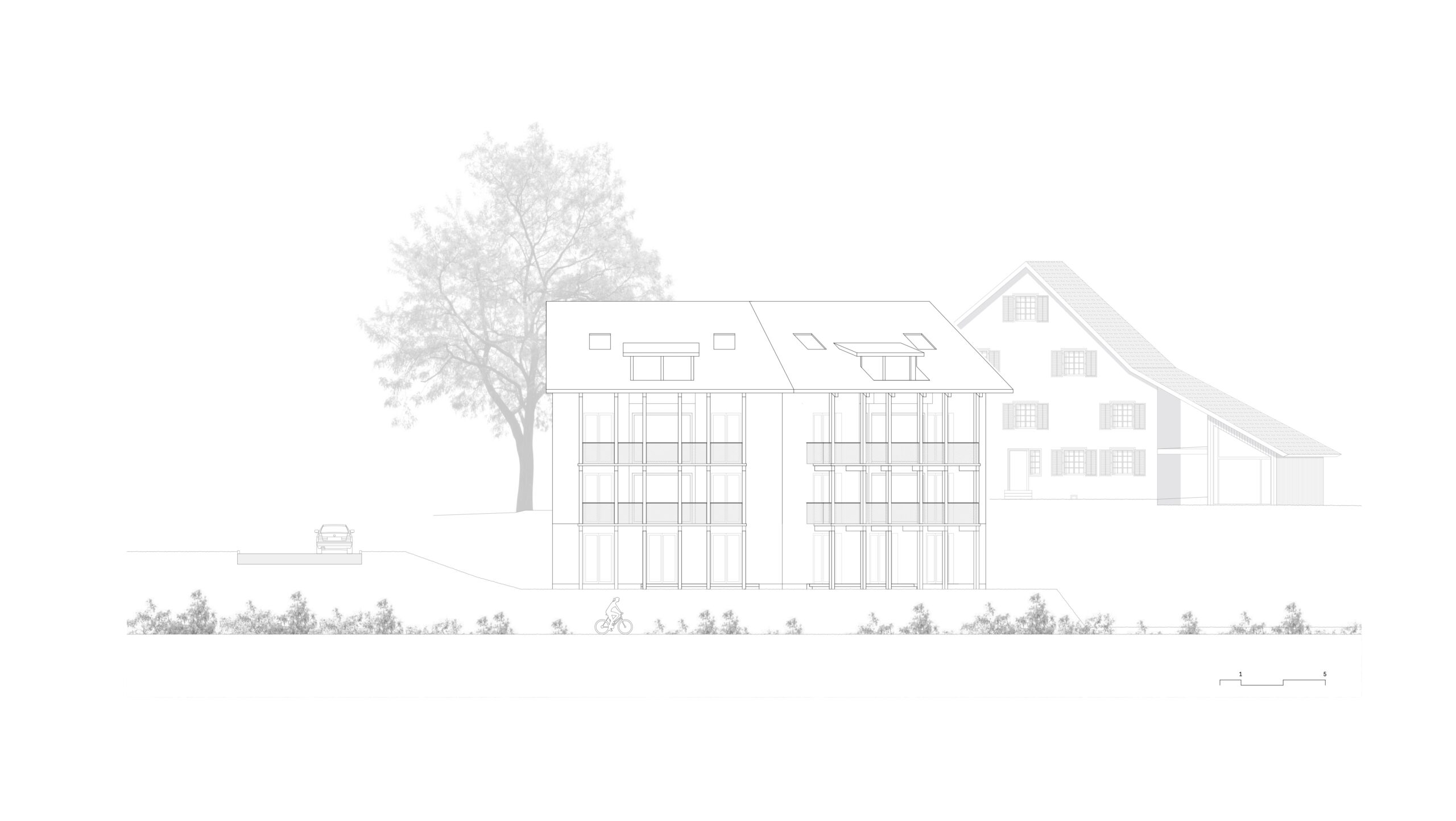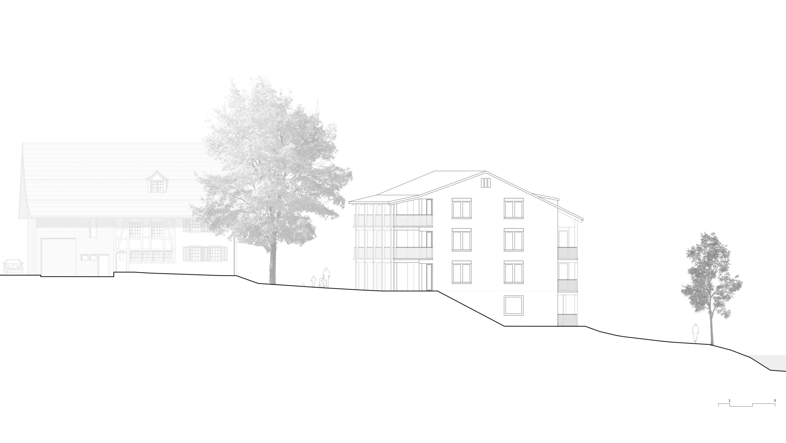 Zusammen mit der alten Linde und dem denkmalgeschützten Bauernhaus entsteht eine neue Platzsituation – eine kleine, aber identitätsstiftende Mitte, die dem neuen Haus seine Adresse gibt. Der markante Knick des Baukörpers öffnet einen hofartigen Aussenraum, der Aufenthalt ermöglicht und zugleich eine Nachbarschaft zwischen Alt und Neu formuliert.