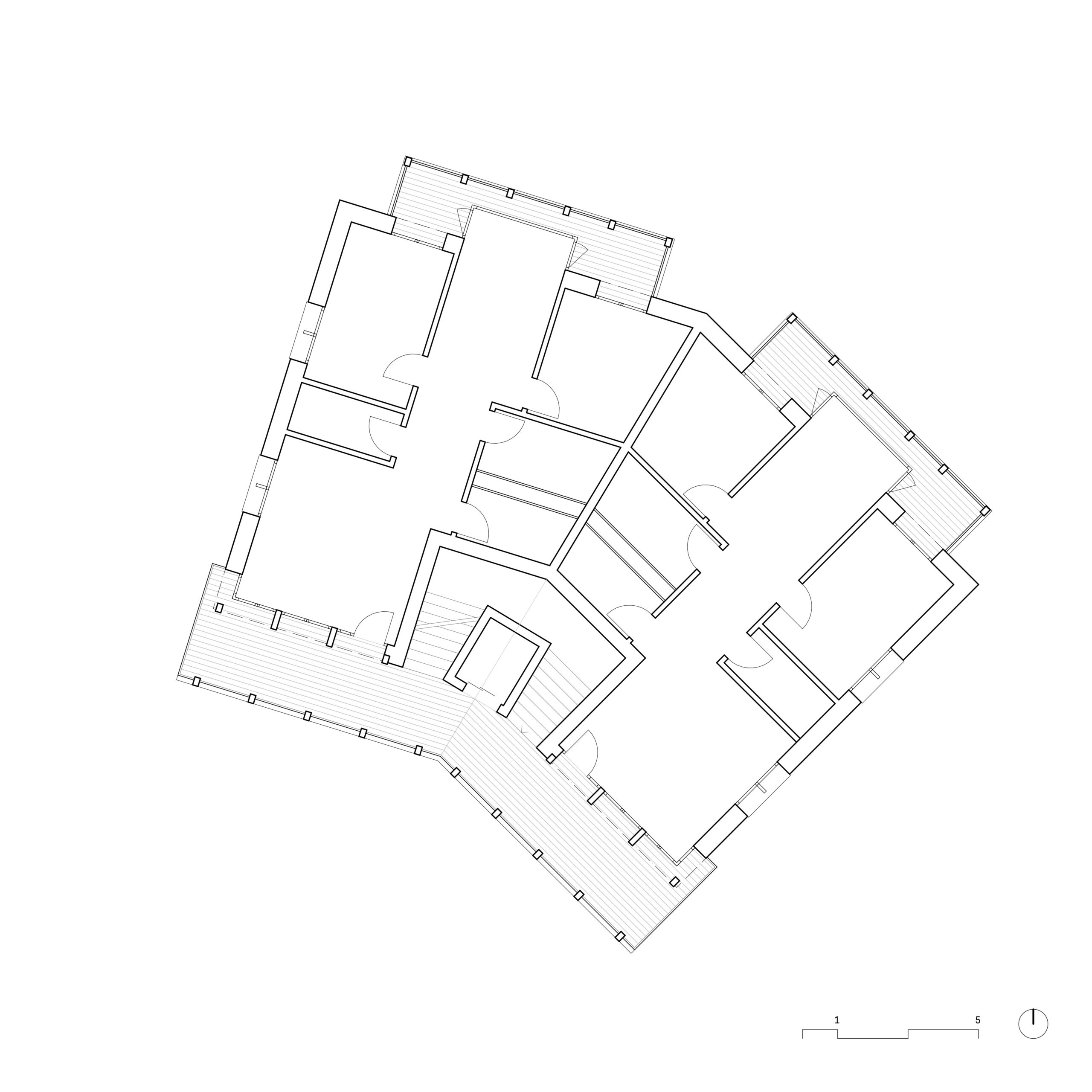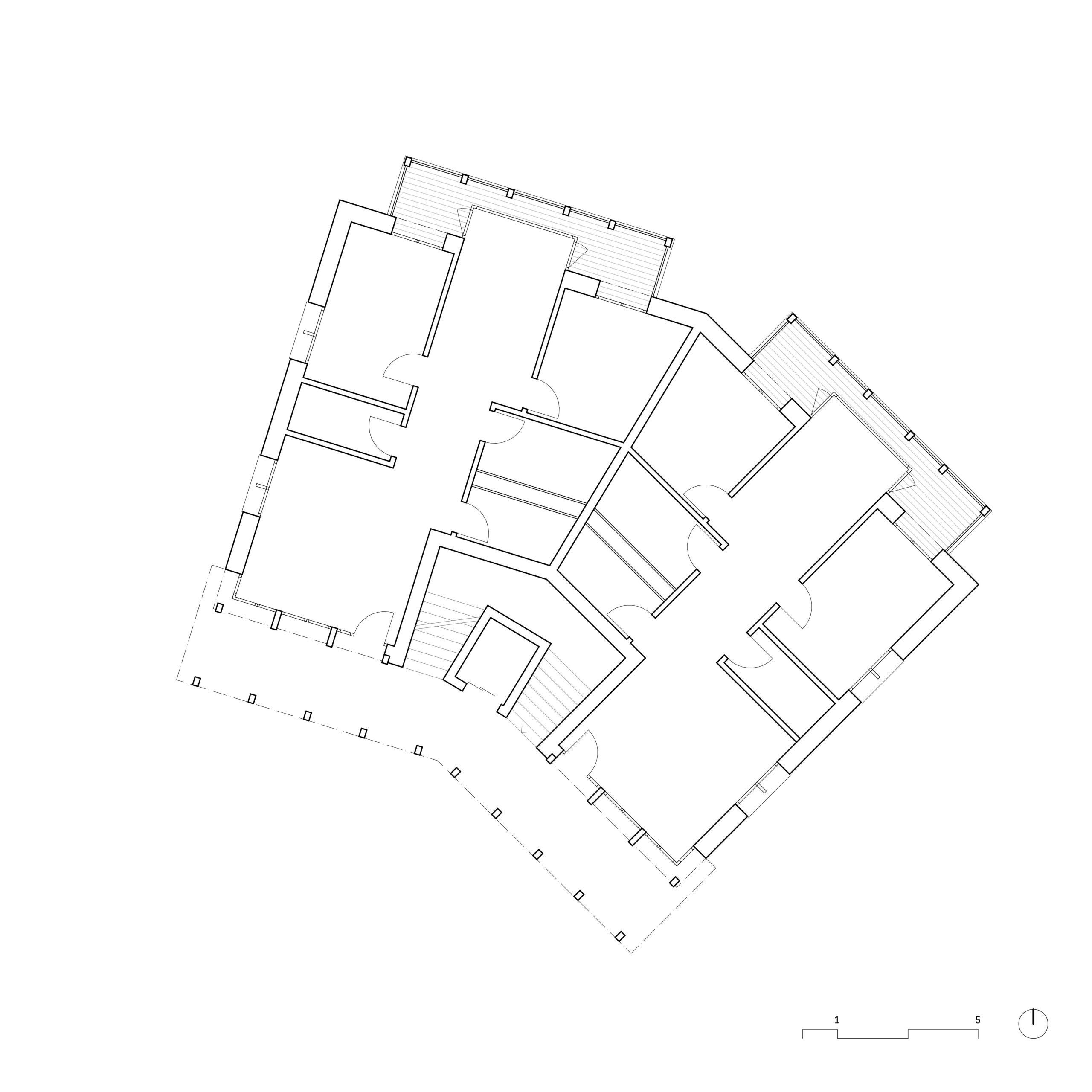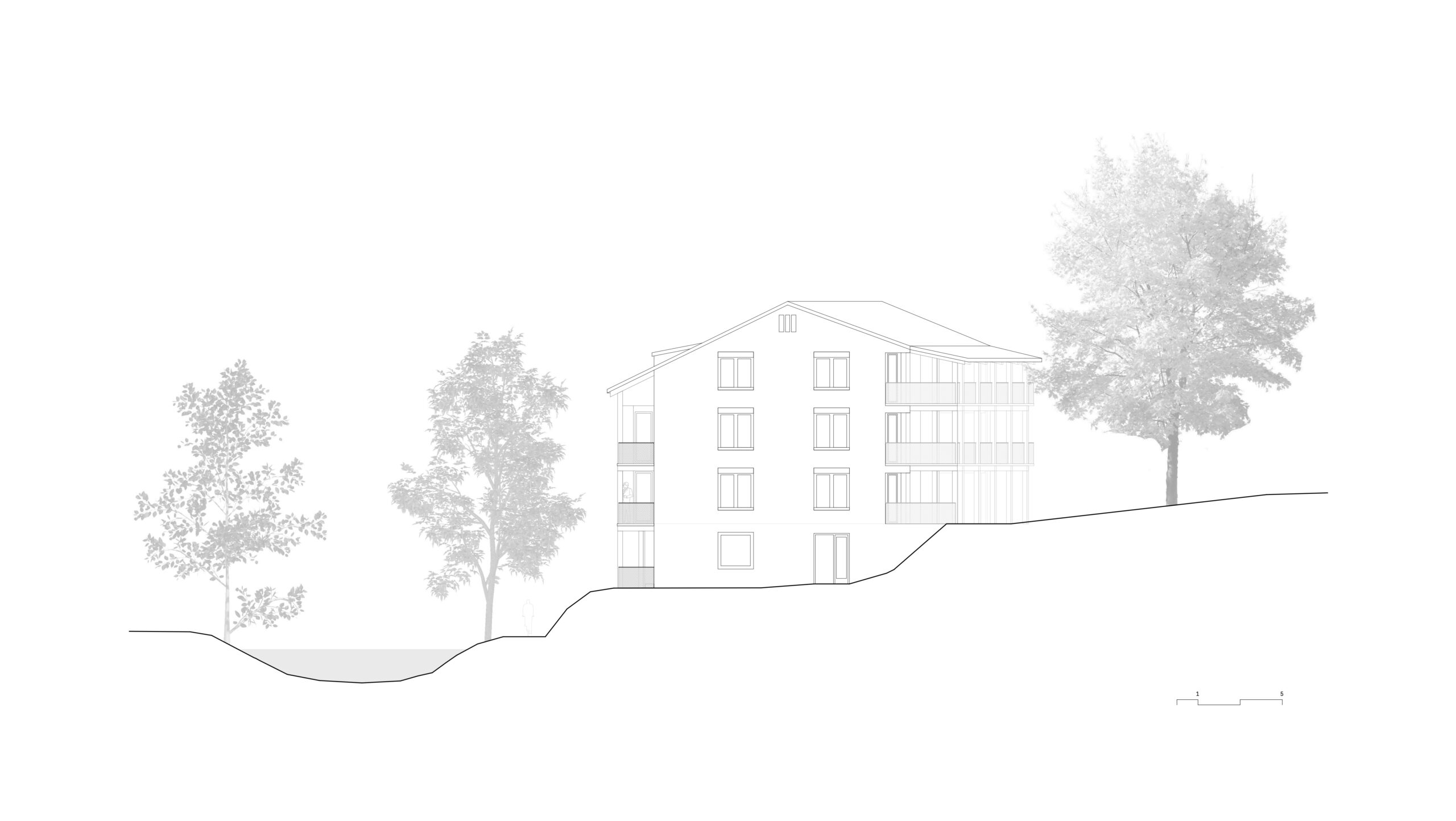 Zusammen mit der alten Linde und dem denkmalgeschützten Bauernhaus entsteht eine neue Platzsituation – eine kleine, aber identitätsstiftende Mitte, die dem neuen Haus seine Adresse gibt. Der markante Knick des Baukörpers öffnet einen hofartigen Aussenraum, der Aufenthalt ermöglicht und zugleich eine Nachbarschaft zwischen Alt und Neu formuliert.
