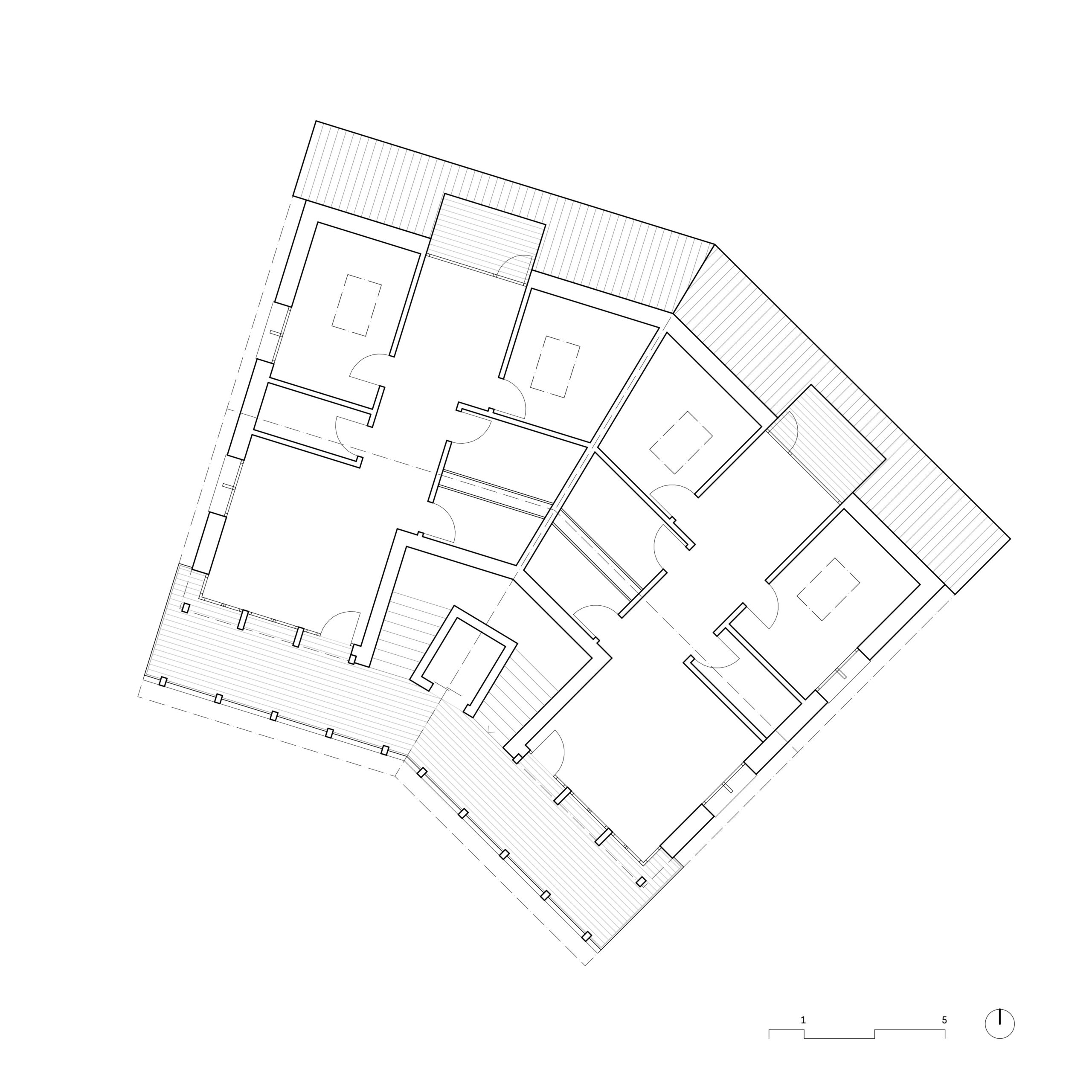 Die Architektur folgt dem Prinzip der Anpassung durch Differenzierung: Das geneigte Dach orientiert sich am traditionellen Satteldach, wird aber durch variierende Traufhöhen neu interpretiert. Gegen den Hof bleibt die Traufe hoch und betont die Raumkante, während sie sich zum Bach hin absenkt und eine weichere Verbindung zum Bestand und zur Topografie ermöglicht. Die gefächerte Form des Volumens vergrössert gezielt die Fassadenfläche zur Bachseite – ein innenräumlicher Gewinn, der das Thema «Wohnen am Wasser» spürbar macht.